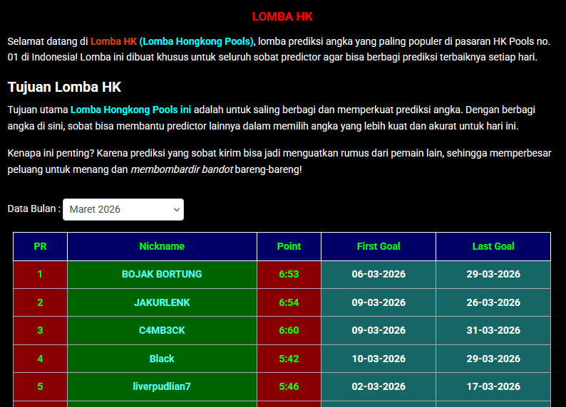 Tujuan utama Lomba Hongkong Pools ini adalah untuk saling berbagi dan memperkuat prediksi angka. Dengan berbagi angka di sini, sobat bisa membantu predictor lainnya dalam memilih angka yang lebih kuat dan akurat untuk hari ini.